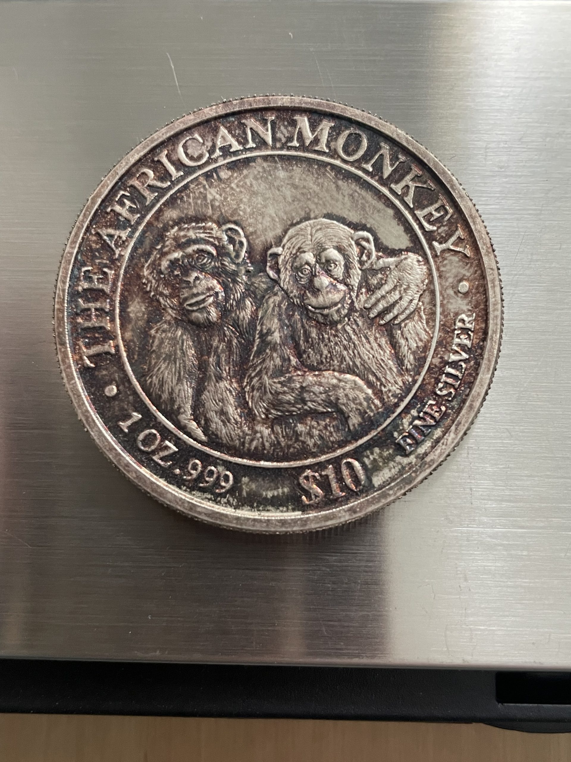 The African Monkey $10 contains 1 Troy ounce 31.2g of pure silver bullion.